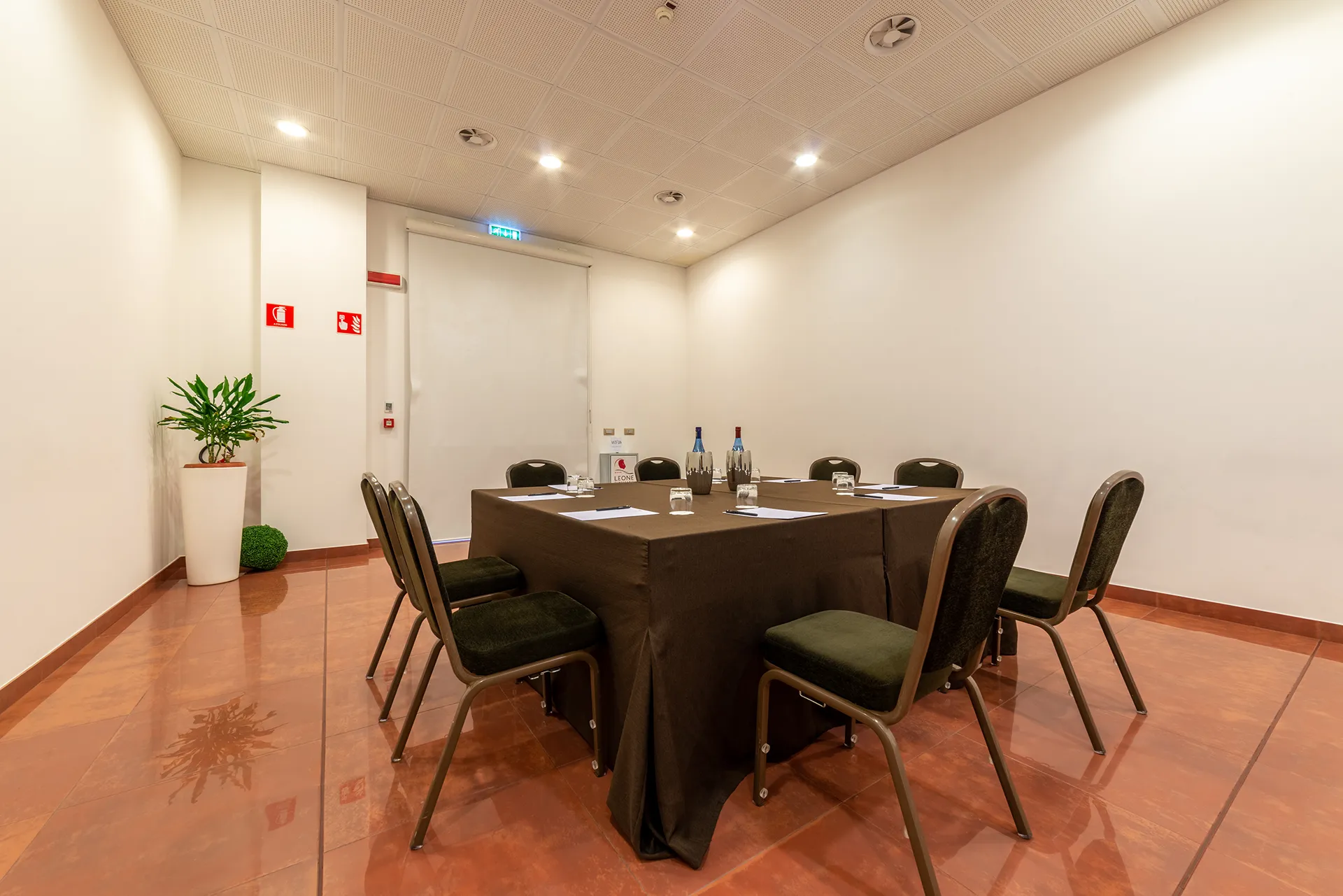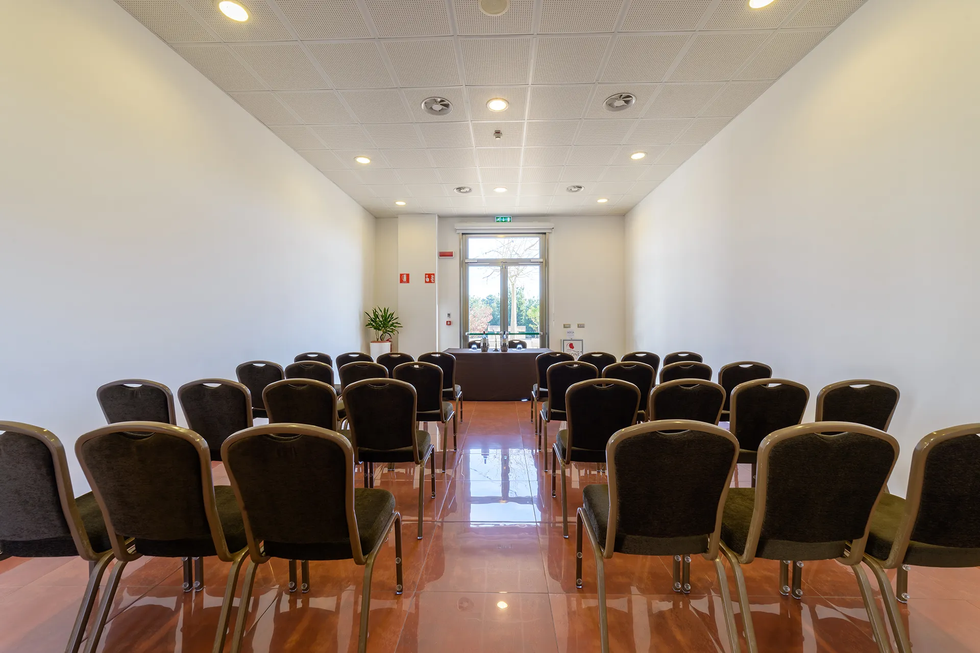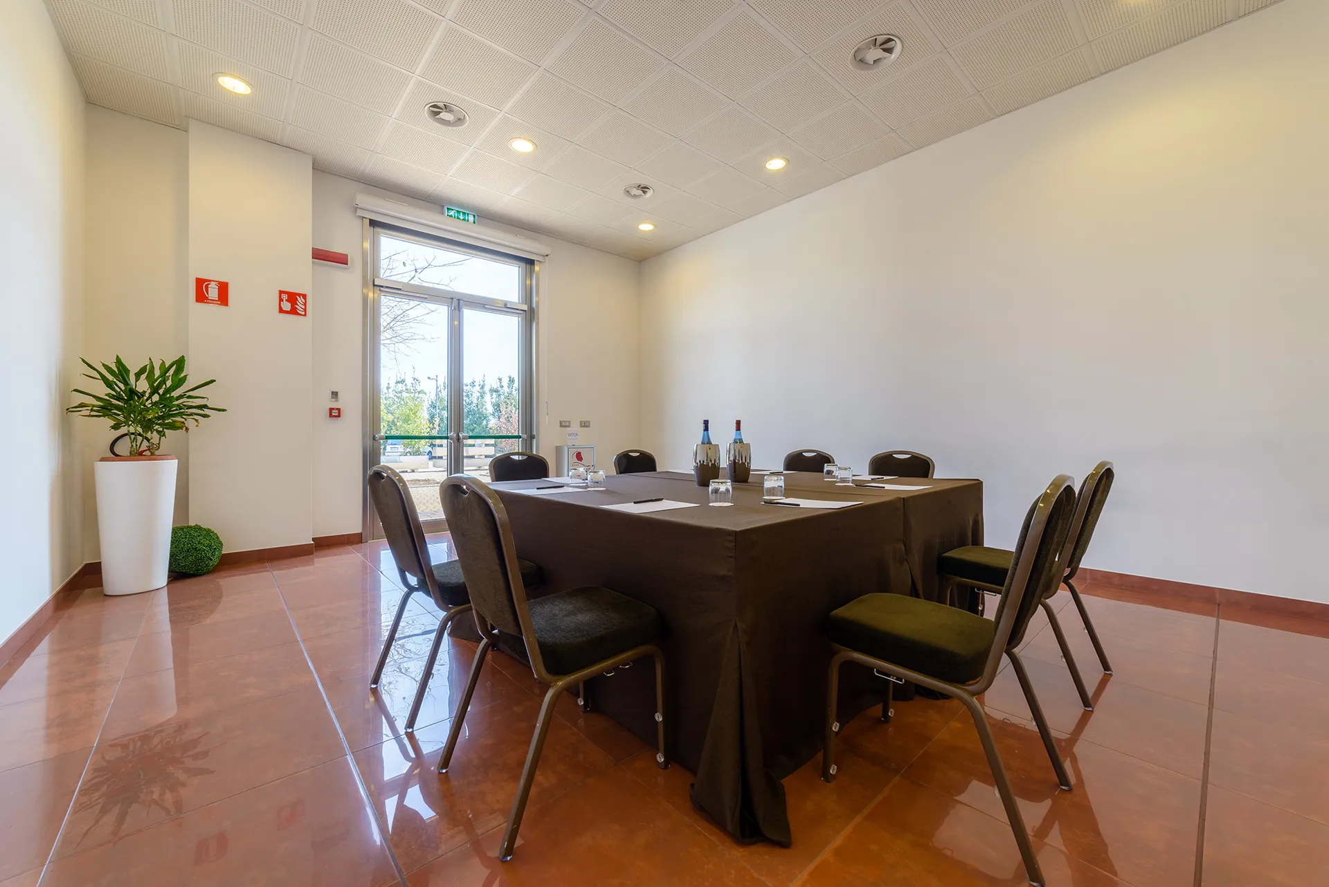 The smallest of the three meeting rooms is located on the ground floor of the hotel, it is equipped with a big French window, that can be obscured during screenings, which allows ample natural light to enter and at the same time a simple and privileged access to load\unload equipments and setups.