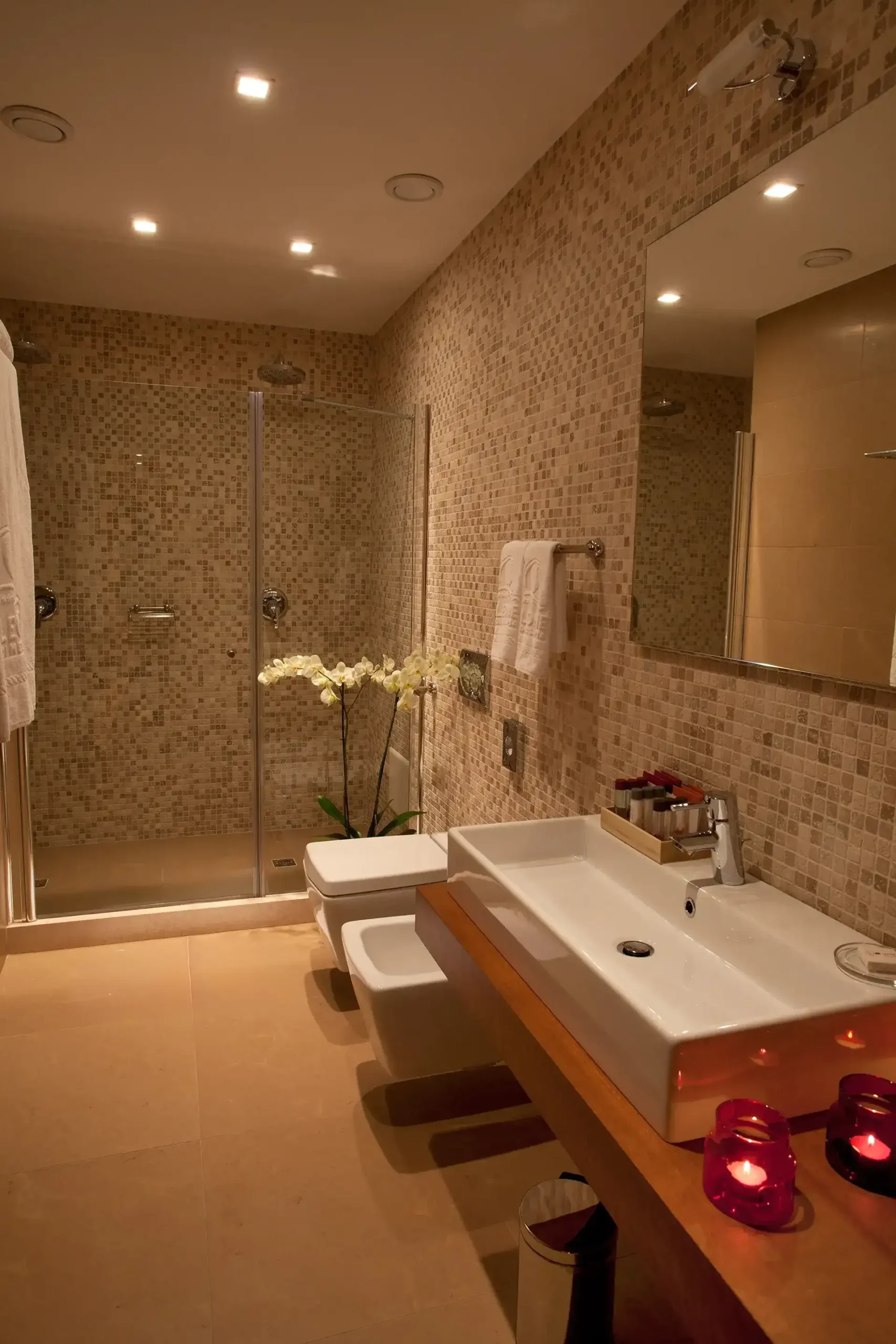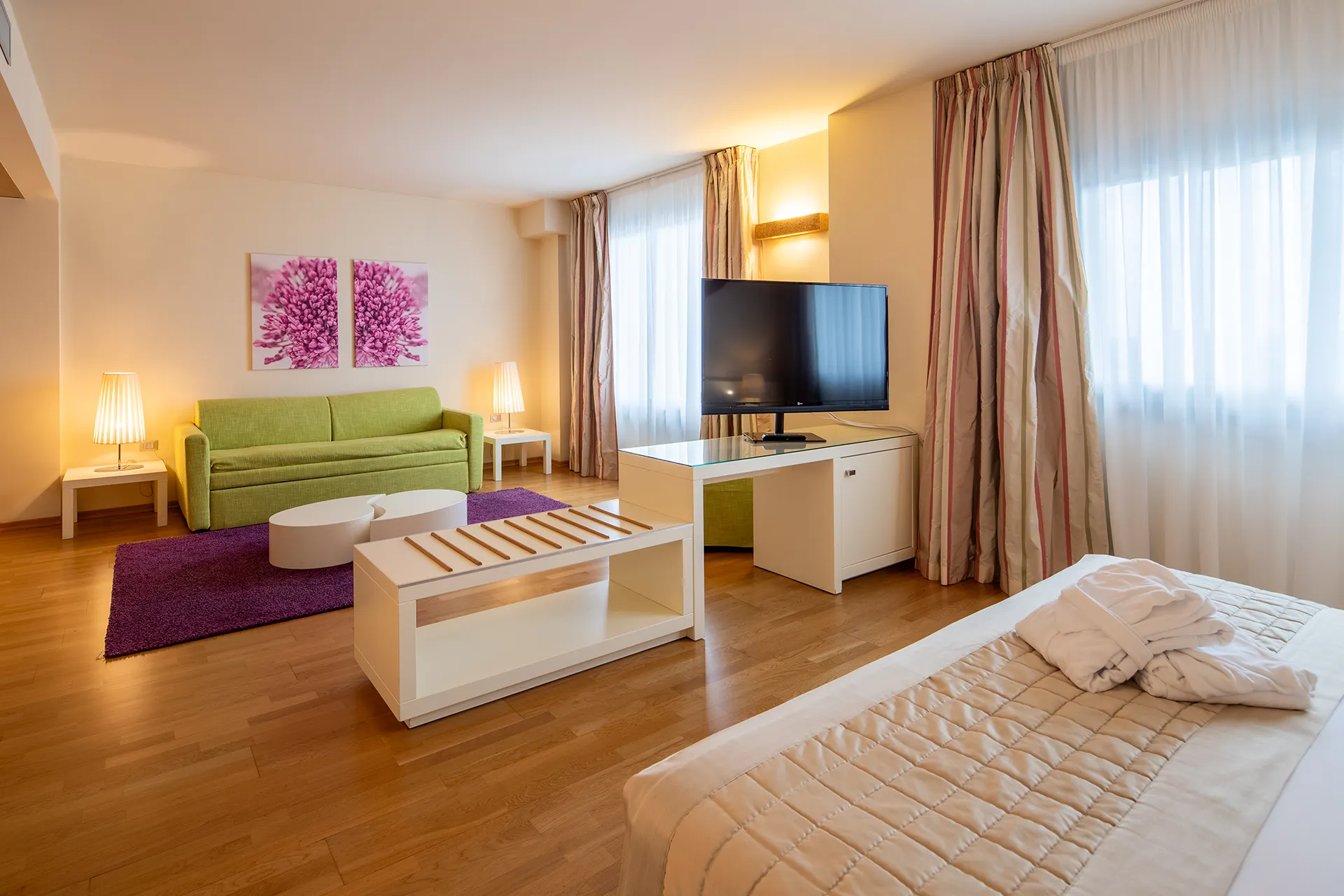 Our Suite Executive in Lecce are developed in a big open space (55 sqm), bathroom with a mosaic two-person shower, parqueted floor, living area with sofa and pouf, 42″ SMART-TV and the top of our services. Moreover, the garage parking is free.